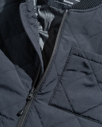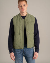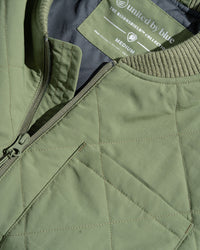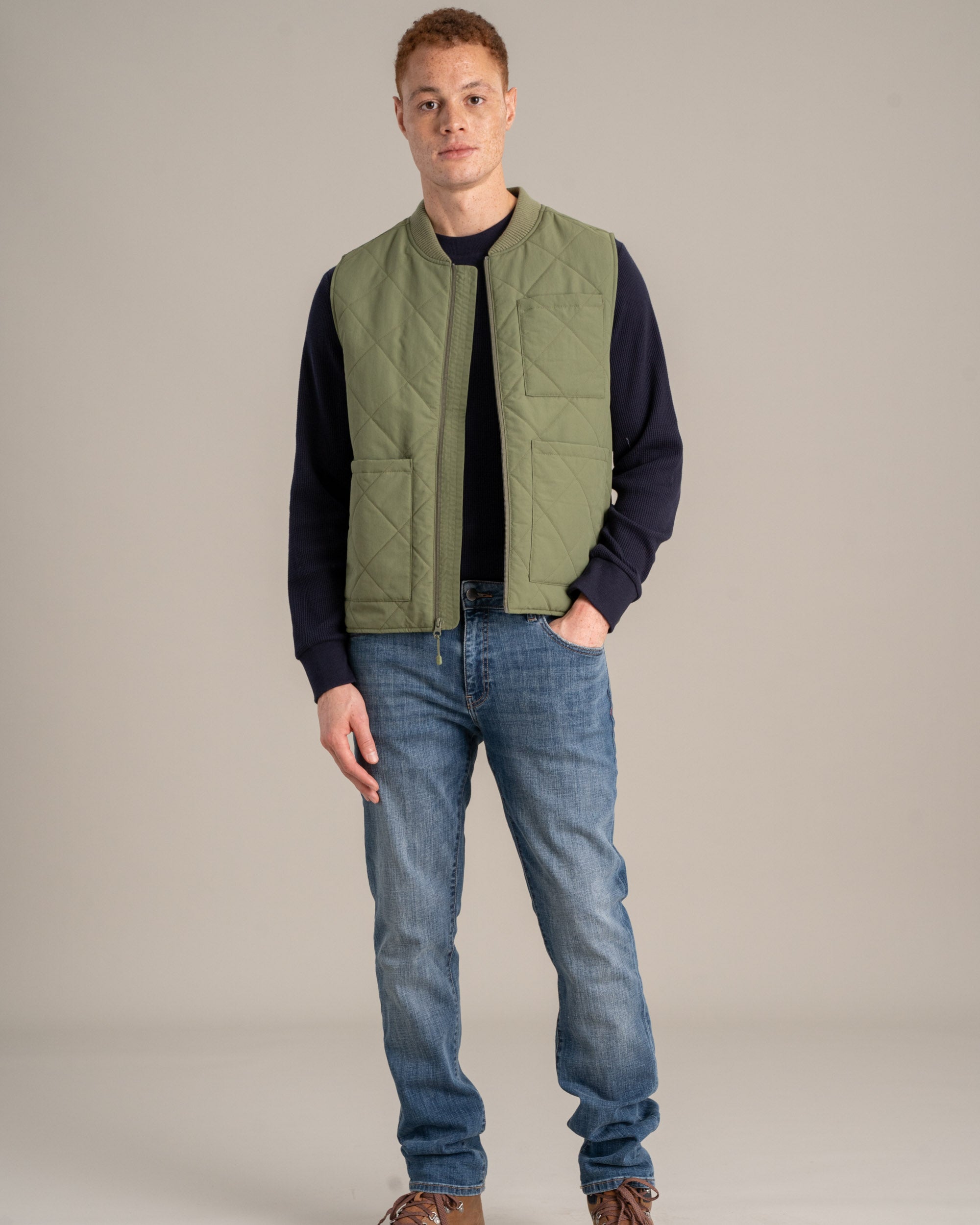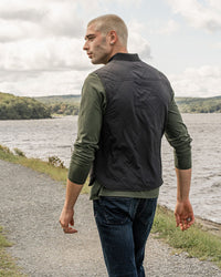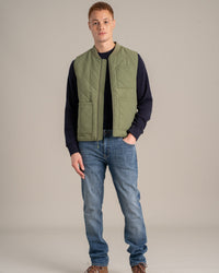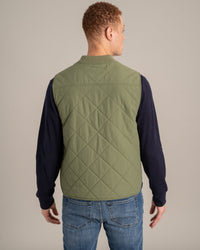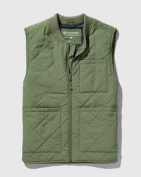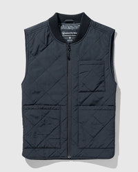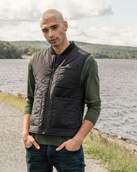 • Quilted midweight vest with water-resistant shell, ribbed fisherman collar, and full zip closure. Patch pocket at left chest and dual patch pockets at sides.